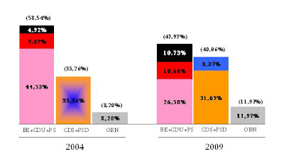 O grande marca destas eleições não é o crescimento do Bloco, mais do que esperado, mas sim o crescimento do Bloco PSD + CDS. Contra todas as expectactivas, leia-se sondagens - o PSD não só vence como conjuntamente com o CDS atinge a barreira dos 40% (+6,8% que em 2004).